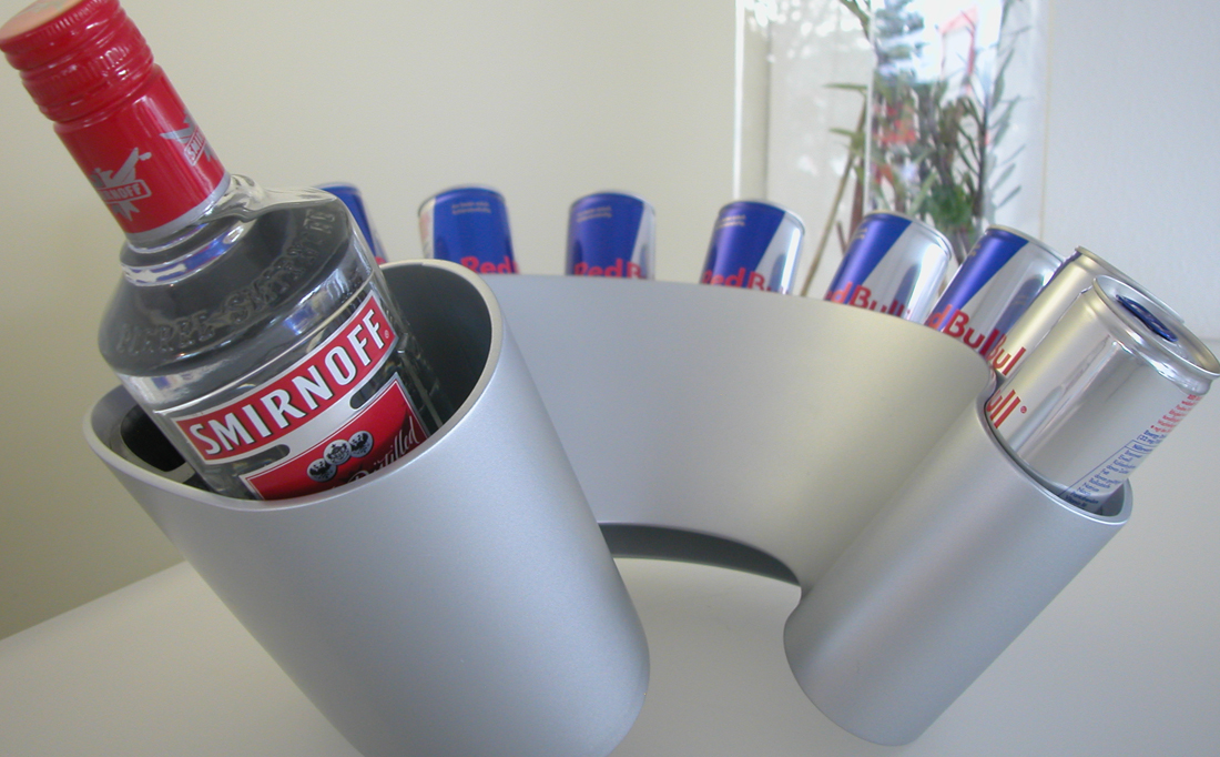 Für Red-Bull entstand diese Servierschale für neun Dosen und eine Flasche Hochprozentigem. Entwickelt wurde dieses Tool für die gehobene Gastronomie. Herkömmliche Gefäße dieser Art interpretieren immer wieder den Kübel, in dem die Getränke in einem Eis-See liegen. Diese eigenwillige Form geht neue Wege und kredenzt die Getränke zum Gast hin und reiht sie um einen Mittelpunkt auf. Höhepunkt bildet das alkoholische Getränk, dass bereit steht um mit RedBull im Glas eine Verbindung ein zu gehen.